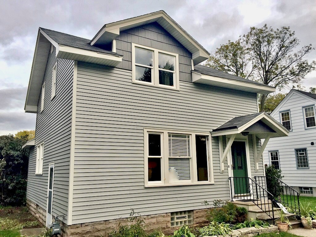 LP Smartside – DK Light Gray w/ Pelican shakes and white trim
